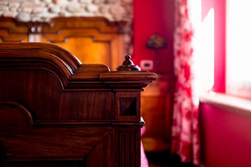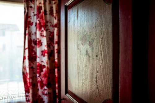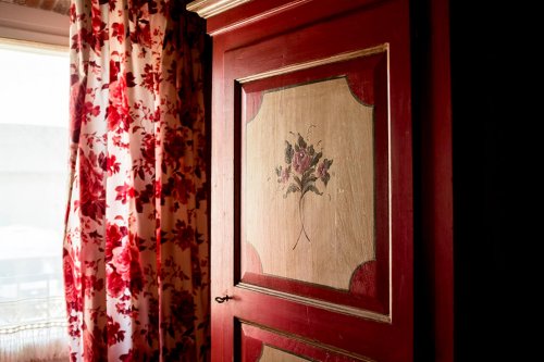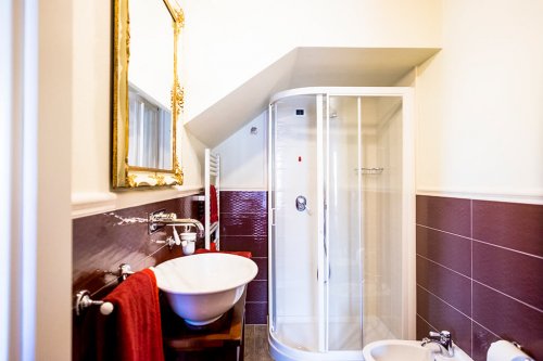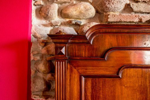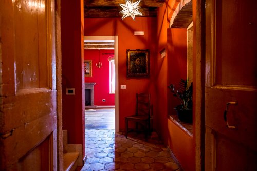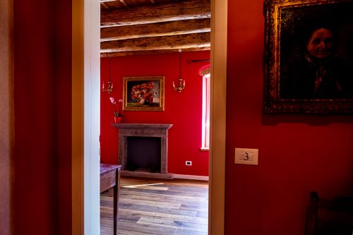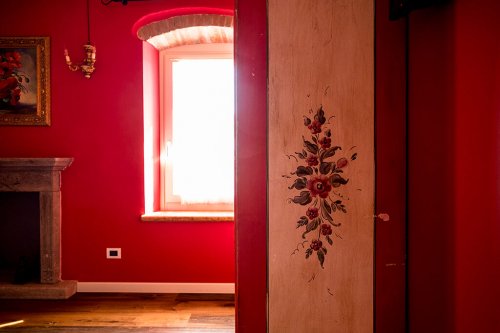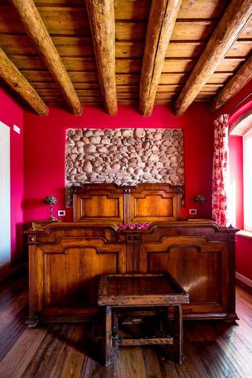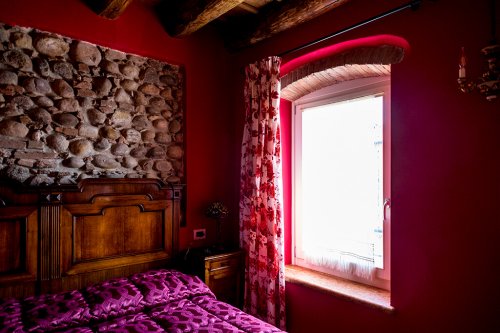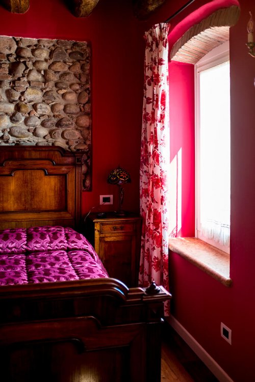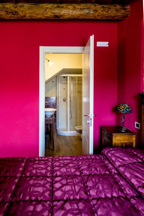 Dieses Zimmer ist in einem stimmungsvollen Geranienrot gestrichen und, wie bei den anderen Zimmern, finden Sie hier ein Kamin aus Peperinstein. Das imposante Bett beginnend '900, die Balken, die sichtbaren Steine und die Vorhänge mit Rosenmuster verleihen dem Zimmer eine sehr angenehme Atmosphäre. Das Bad, mit beigen und bordeaux-farbigen Fliesen, schmückt ein antik gerahmter Spiegel.