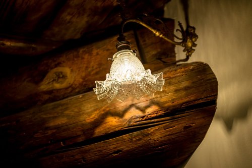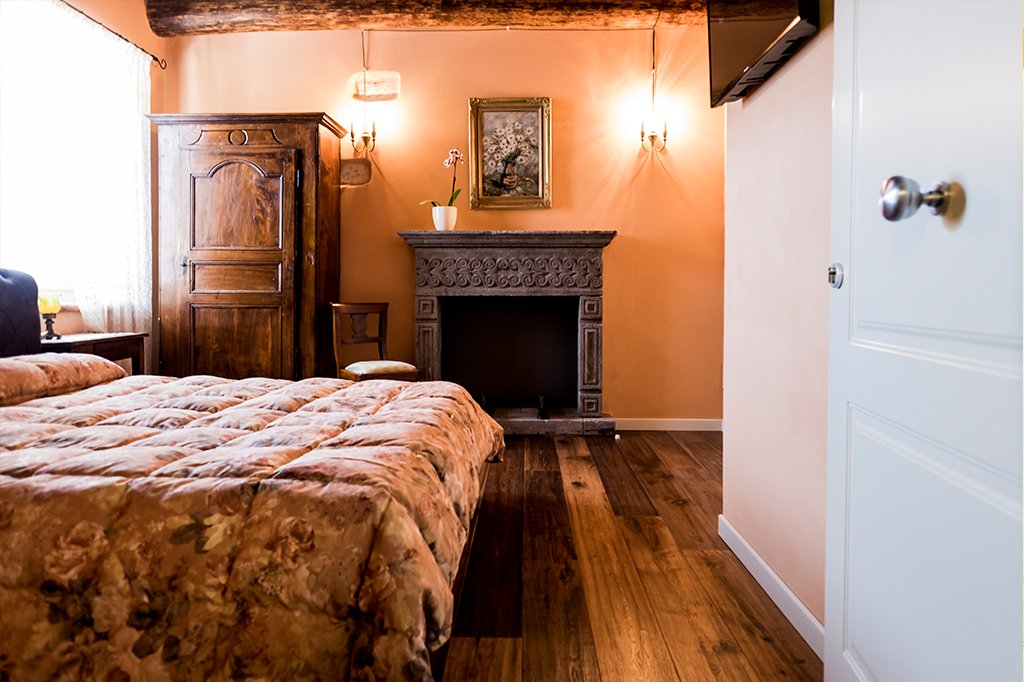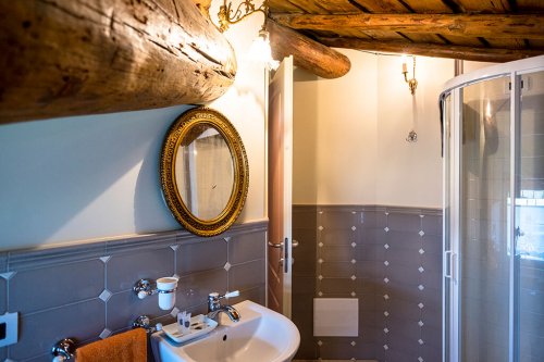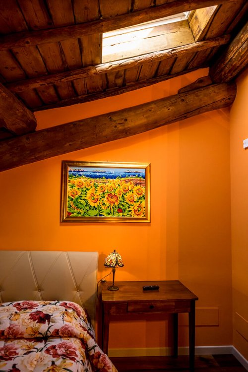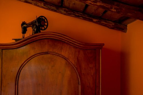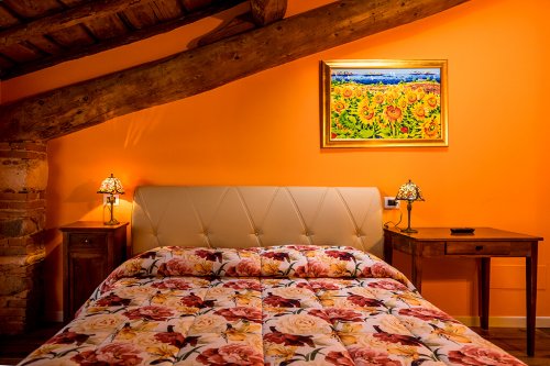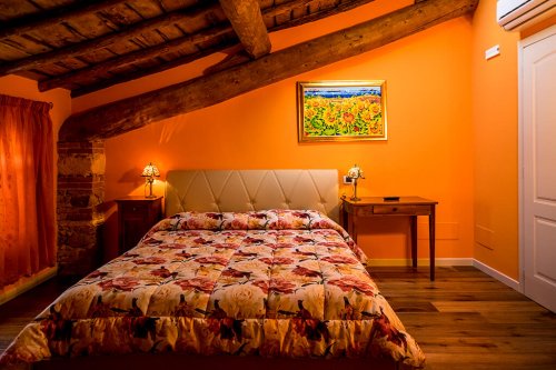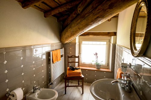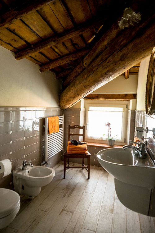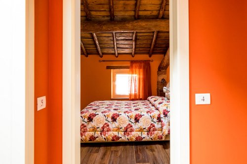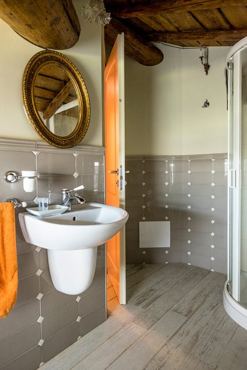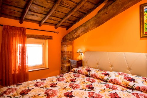 Brenda’s room is painted in orange, with embroidered curtains also in orange. These bright colors emphasize the important beams of the ceiling and the ancient tuff pillow and exposed bricks. The bright bath is decorated in contrast with the colors of dove-grey and cream.