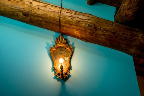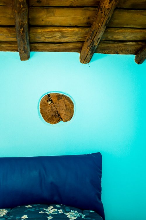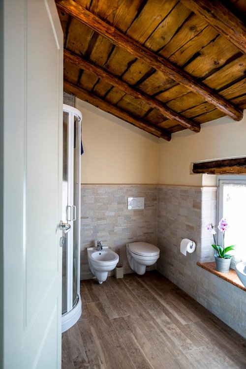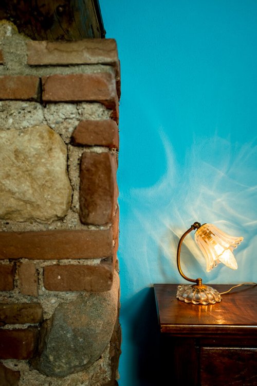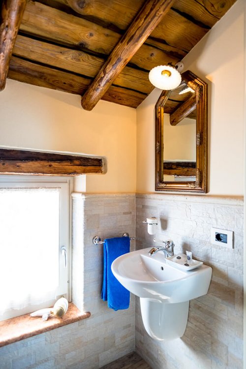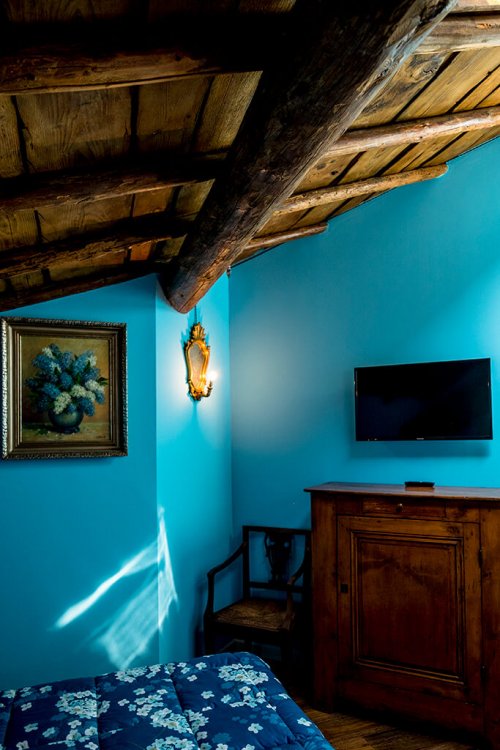 The room dedicated to her is the only single of the Relais, painted in a beautiful blue shade. It has an intense blue French bed size and a large and bright natural stone bath and tuff with a sliding window overlooking the rooftops and the countryside.