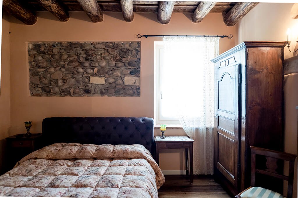 La stanza, dipinta in un piacevole color pesca, è sita a pianterreno ed è arricchita da un camino di pietra peperino. L’ampio bagno, giocato con i colori della pietra e del cotto, ha un grande box doccia ed un originale bacino in marmo rosso di Verona.